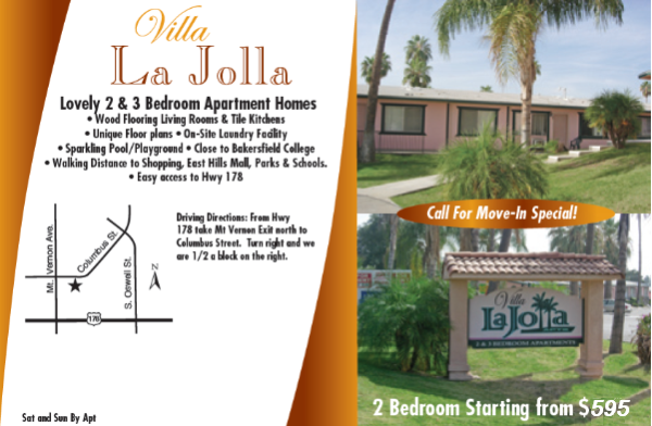 With great access to nearby shopping and highways, Villa La Jolla is a great combination of serenity and city life. Our beautiful one floor apartment homes, are spacious and easily accessible. This building has Laundry Facilities, a playground and a pool.
